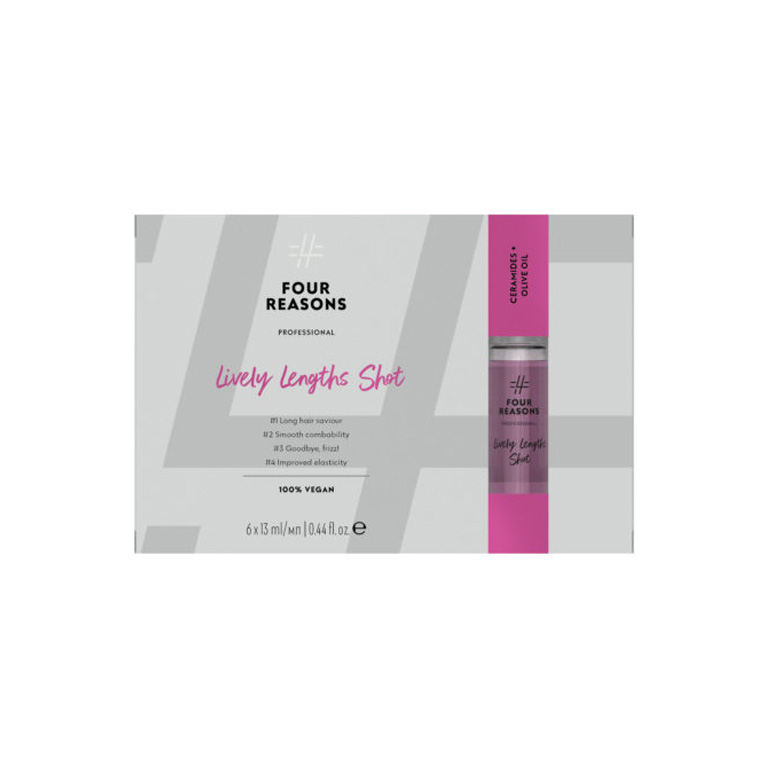 A Four Reasons Professional Shots ampulla-kezelés professzionális használatra kifejlesztett termékcsalád. A 100% vegán ampulla-formula kibővíti és magasabb szintre emeli a fodrász szalonszolgáltatásait.